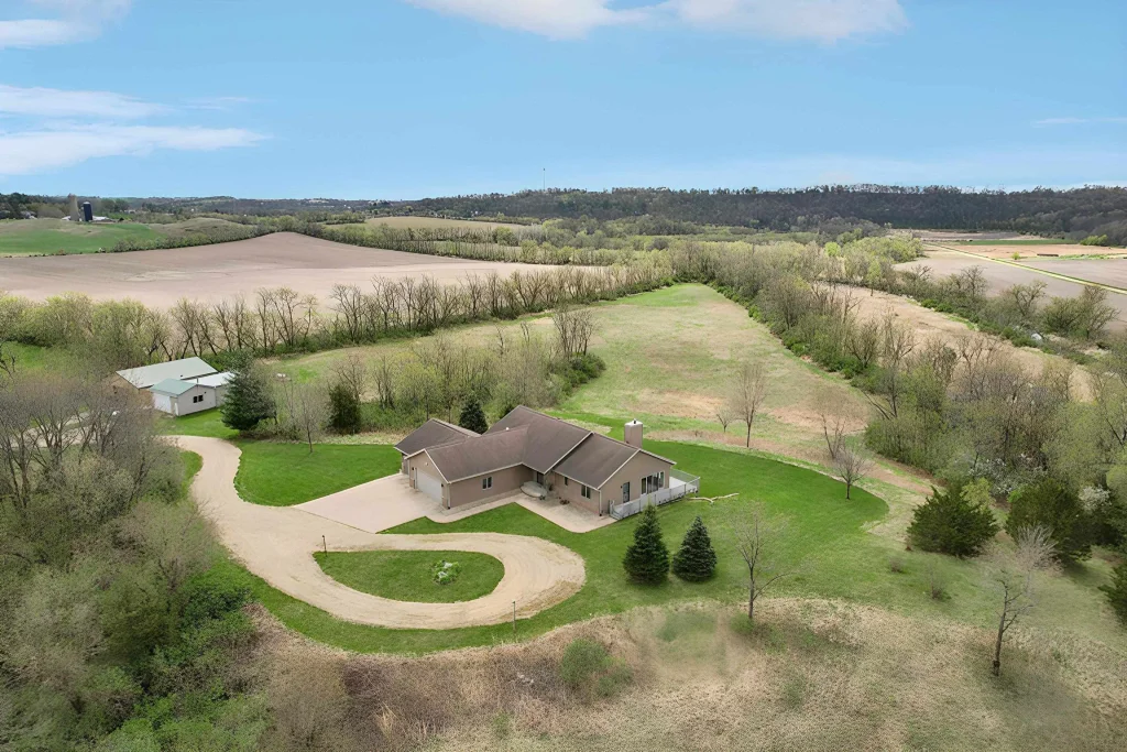 61-acre retreat with 3,000+ feet of water frontage on the Pecatonica River offers ultimate serenity and privacy. This one-owner, custom-built ranch features gleaming hardwood floors, an open-concept design, and peaceful country living. The kitchen includes a gas range, extra wall oven, ample cabinet space, and breakfast bar seating. Great room with vaulted ceiling and stone fireplace. Relax in the sunroom and watch abundant wildlife. Spacious primary suite with en suite bath and walk-in closet. Walkout lower level with second kitchen and rec room—perfect for entertaining. Heated 3-car garage, 40x50 storage building, and 1,076 sq ft heated shop. Hunt, camp, fish, or kayak. 21 acres enrolled in CRP.