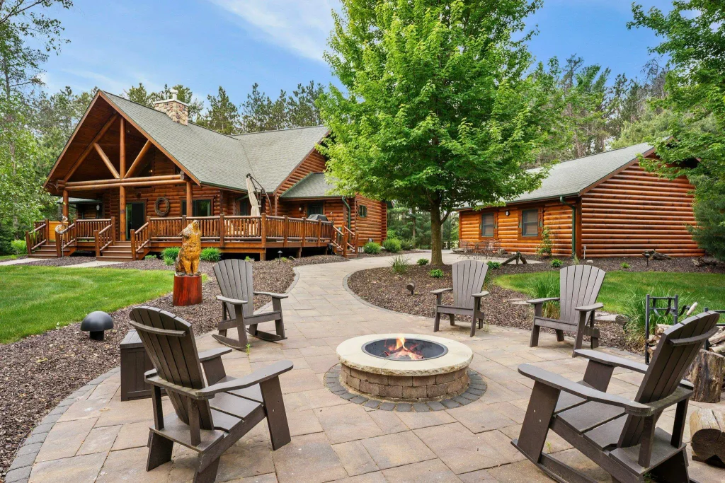 Stunning Log Cabin Escape nestled on 4.55 acres near Castle Rock Lake. Exceptionally cared for and showcasing a grand great room with soaring ceilings, an expansive kitchen with granite island and ample cabinetry, main level primary suite, two upstairs bedrooms, spacious loft, and a finished lower level with second kitchen ideal for guests. Recent improvements include a beautiful stone paver fire pit and walkway off the deck, plus a newly paved wide driveway and entrance. In 2024, the home, deck, and garage were professionally re-stained. Explore your own wooded oasis with groomed trails, a volleyball court, and bonus storage in a detached small garage—plus an oversized, heated 2-car garage perfect for entertaining. Handicap accessible with a ramped entry and elevator lift. A must see!