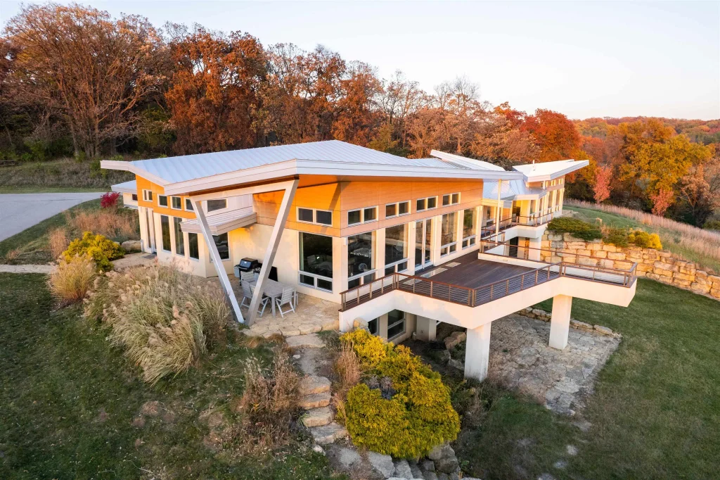 Frank Lloyd Wright meets Frank Gehry in this stunning fusion of midcentury modern and contemporary design. This south-facing, hilltop property is set on 15.5 acres with 3 acres of mature woods and breathtaking Driftless views. This custom masterpiece must be seen to be believed. The expansive Great Room anchors the home, complemented by a chef’s kitchen with Subzero/Wolf appliances, quartz countertops, cork floors, and touchless faucets. Built sustainably with Eco-clad siding, SIPs construction, and a Brazilian Ipe deck. Features include whole-house 7-zone audio, Paradigm 5.1 surround sound, passive heating/cooling, 9-zone radiant floors, a 4-ton geothermal system, and Loewen triple-pane windows—HVAC costs only $1,500/year. Lower 2 beds/baths unfinished. https://8680messerschmidtdrive.com