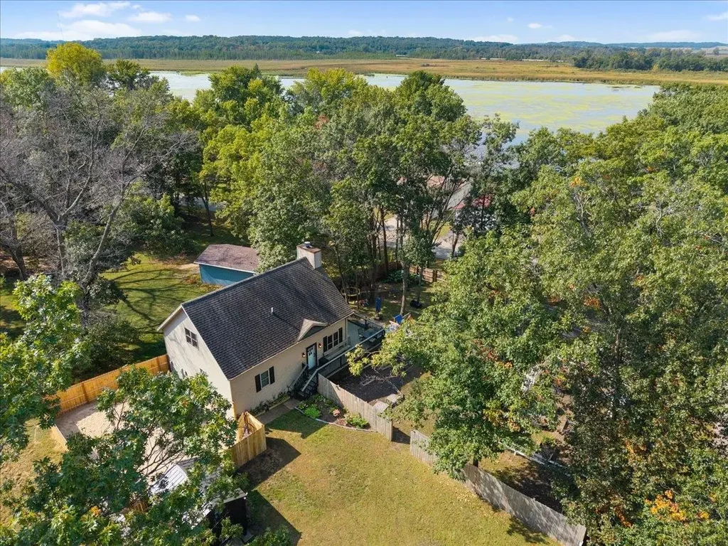 Experience peaceful serenity in this rustic-chic retreat just under an hour from Madison! Set on a scenic wooded corner lot with tranquil views of Buffalo Lake across the street, this property offers a private sand oasis suited for a firepit or hot tub and fully fenced yard with maintenance-free wrap-around deck that makes outdoor living effortless. Inside, enjoy soaring vaulted ceilings as you sit by the wood fireplace looking out over the lake. First-floor laundry, updated kitchen and two bedrooms complete first floor. Owners suite in upstairs loft offers privacy and basement finished with rec room, office and full bath for added space. Whether as a full-time home, weekend getaway, or an incredible VRBO opportunity, this property delivers relaxation, convenience, and timeless appeal!